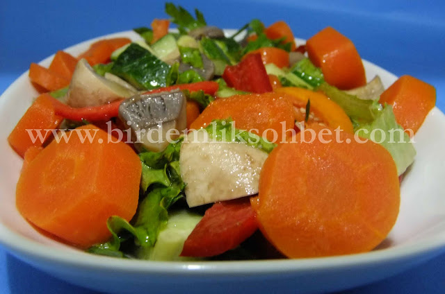 Bir kase içerine salatalıklar kabukları soyulmadan doğranır.Kıvırcıklar ve biberler de doğranıp üzerine soğuyan mantar ve havuçlar ilave edilip yağı ve tuzu konulup servis edilir.